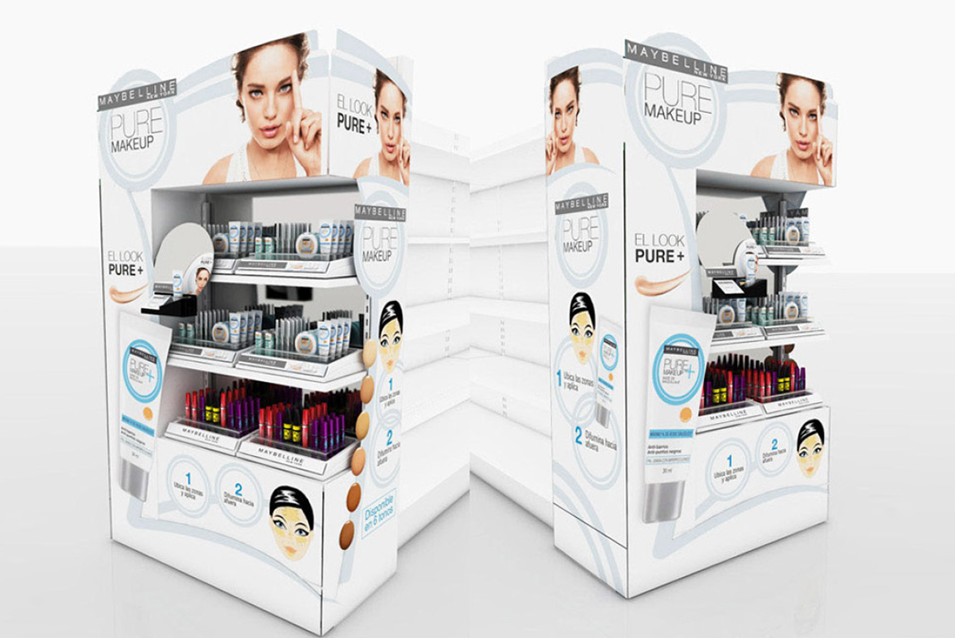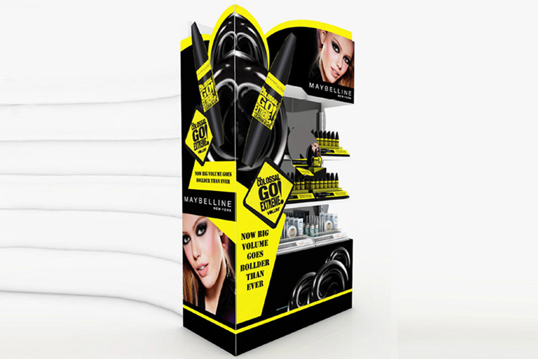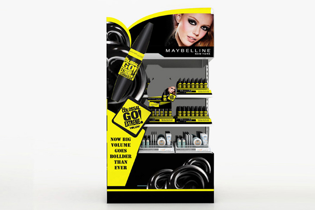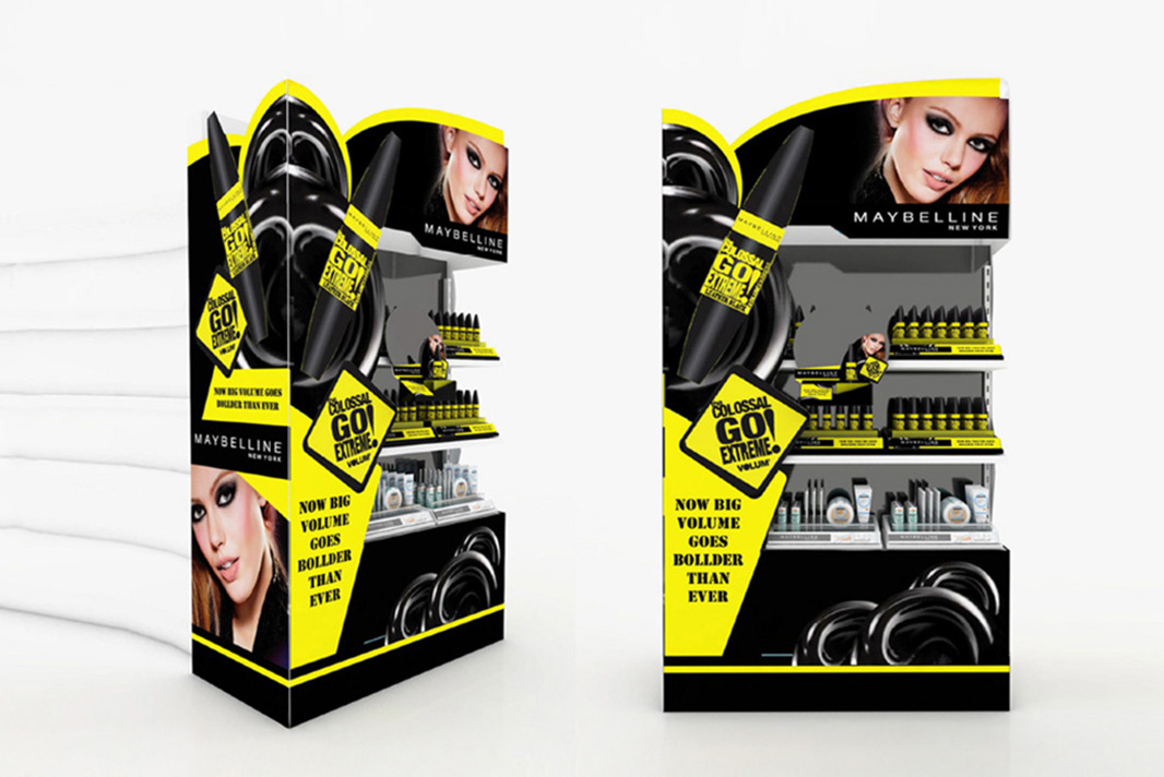 Two innovative and thoughtfully designed product display stands were created for Maybelline New York, showcasing their latest offerings with distinct visual appeal. The first stand prominently features the Colossal Go Extreme mascara, combining creative design with strategic visual elements to deliver a bold and captivating presentation that effectively draws consumer attention. The second stand highlights Maybelline’s Pure Makeup line, designed with a fresh and clean aesthetic that emphasizes natural beauty and simplicity. Both displays integrate dynamic styling and clear branding, successfully highlighting the unique qualities of each product while reinforcing Maybelline’s energetic and modern brand identity.